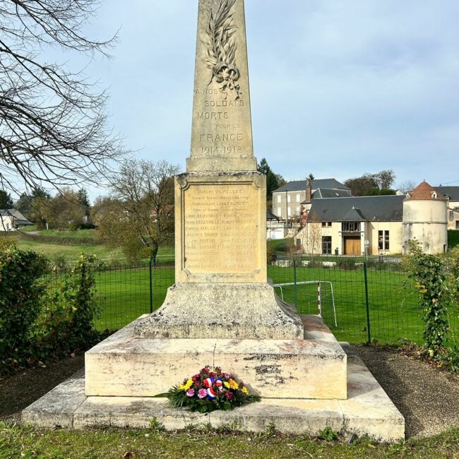 • Dès juillet 1919, une souscription est ouverte afin d’ériger un monument, mais la population s’oppose à son érection sur le place publique – où les fêtes du pays se tiennent avec bal sur un parquet à l’ombre des 3 ormes de la liberté plantés en 1848 – et interdit toute souscription nominative. Maire de 1908 à 1919, Jules Villepelet-Chavet, éconduit aux élections municipales de l’automne fait alors ériger à ses frais et sur sa propreté un monument par C.Deslandes, entrepreneur berruyer, avant de le céder à la commune en 1925, après sa réélection comme premier magistrat en 1924. La pyramide de pierre, dressée sur un soubassement massif du fait de la déclivité du terrain, est ornée d’une palme sculptée en relief du coté de la route et d’une crois latine sur la face opposée. Elle porte l’inscription « A nos soldats morts pour la France 1914-1918 » et une liste de 34 noms gravé.