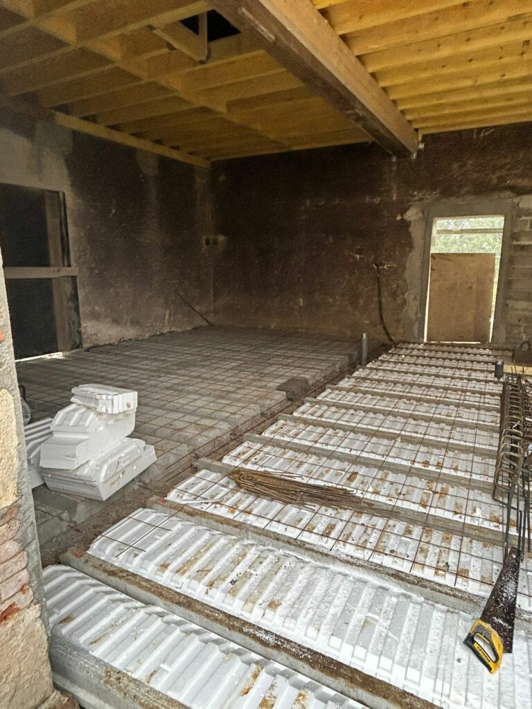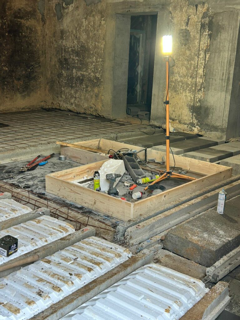 Préparation plancher sur cavePréparation plancher sur caveMise en place plancher bétonMise en place planché béton, vue de la caveMise en place planché completCondamnation porte caveCondamnation fenêtre caveMise en place isolant plancher restaurant